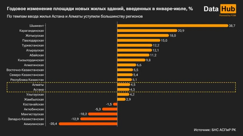 При этом по темпам ввода жилья обе столицы проигрывают 11 из 18 оставшихся регионов. Причем сильнее всего — Шымкенту, где этот показатель подскочил на 38,7%.