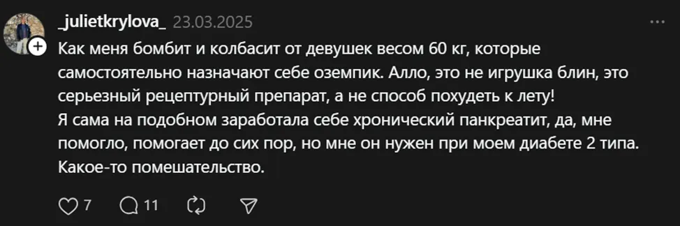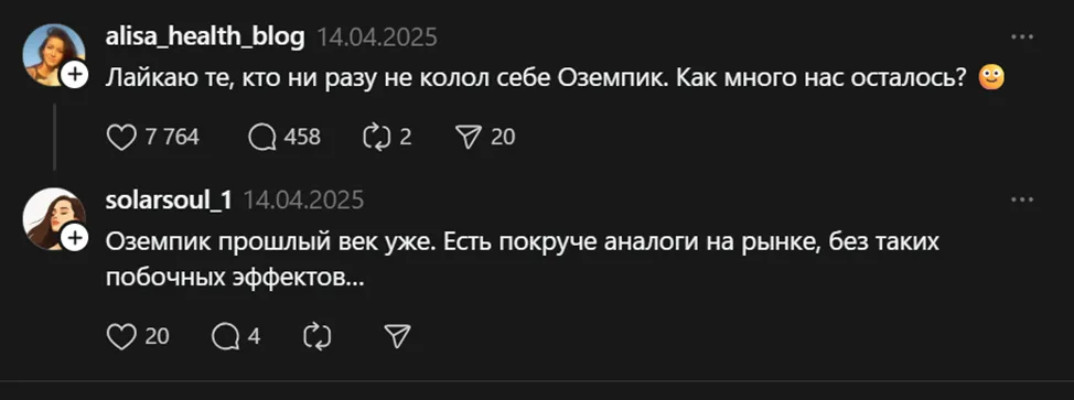 Совсем другое дело, когда речь заходит о быстрых и лёгких способах похудения. Социальные сети завалены всевозможными рассказами о личном опыте использования "Оземпика". В народе он быстро обрёл популярность, несмотря на то, что продаётся только по рецепту. При чём препарат, судя по сообщениям в соцсетях, действительно работает.