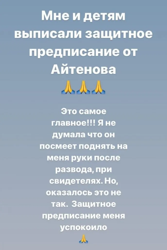 Вместе с тем, адвокат Атешовой Дамир Ишмаметов заявил, что помимо административной статьи по факту нападения Айтенова на экс-супругу в полиции завели еще и уголовное дело.