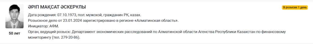 Инициатор розыска – Департамент экономических расследований по Алматинской области АФМ РК.
