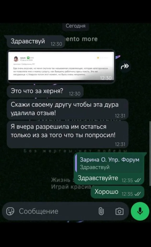 "Естественно осадок неприятный остался. Я пишу отзыв без оскорблений и клеветы, далее реакция управляющей заведения (пишет это другу мужа, который там работает), далее нам уже звонят, угрожают её знакомые, что если не удалим отзыв, то мы очень пожалеем", – написала она.