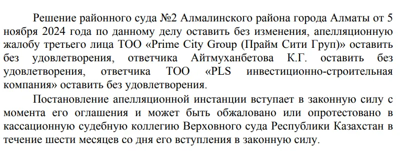Но с таким решением не согласились новые владельцы имущества: Кайрат Айтмуханбетов и ТОО «PLS инвестиционно-строительная компания», а также третье лицо ТОО «Prime City Group (Прайм Сити Груп)». Они подали апелляционные жалобы. 27 января 2025 года в Алматинском городском суде им отказали. Опротестовать решение могут в Верховном суде в течение шести месяцев.