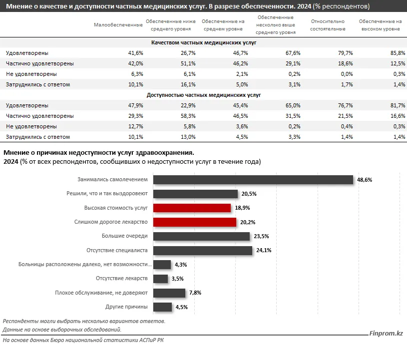 У казахстанцев с высоким уровнем обеспеченности проблема доступности платных медуслуг почти не возникает 81,7%, следует из предоставленного анализа.