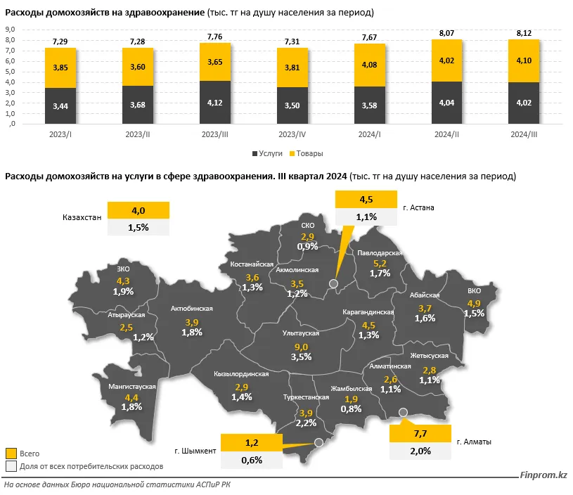 Если верить результатам выборочных обследований БНС, наибольшие расходы за платные услуги здравоохранения в третьем квартале прошлого года пришлись на область Улытау – 9 тыс. и Алматы – 7,7 тыс. Меньше всего тратили жители Шымкента – 1,2 тыс. и Жамбылской области – 1,9 тыс. тенге. При этом за год расходы на платную медицину увеличились на 12,5%, в июне–сентябре 2023 показатель составлял 3,7 тыс. тенге.