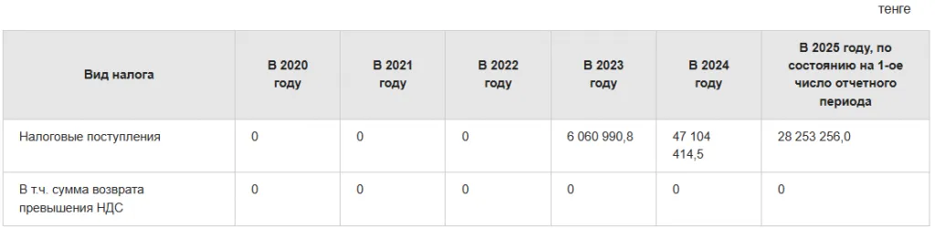 Согласно данным сайта КГД, платить налоги ТОО начало в 2023 году. За три года компания пополнила казну государства на 82,2 млн тенге.