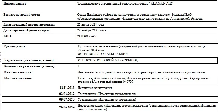 ТОО "ALAMAN AIR" создали 22 ноября 2021 года. Компанию зарегистрировали в Алматинской области, Илийский район, посёлок Боралдай. Учредителем предприятия значится Юрий Севостьянов. Директорское кресло занимает Ербол Оспанов.