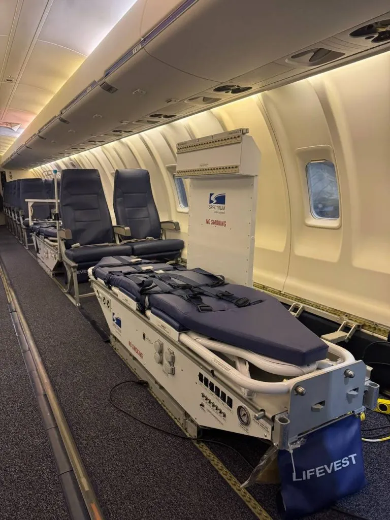 Самолёт Bombardier CRJ-200 оборудован двумя сертифицированными в РК медицинскими модулями Spectrum Aeromed производства США. Это позволяет транспортировку двух пациентов одновременно. Воздушное судно может выполнять внутренние рейсы без дозаправки авиатопливом. Может перевозить бригады трансплантологов и медперсонала в количестве до 35 человек.