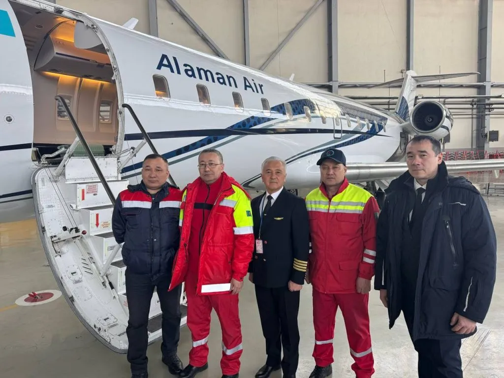 В Минздраве сообщили, что новый турбореактивный специализированный самолёт Bombardier Challenger ТОО «ALAMAN AIR», который совершал перелёт, оснащён двумя медицинскими модулями для сопровождения пациентов в тяжелом состоянии.