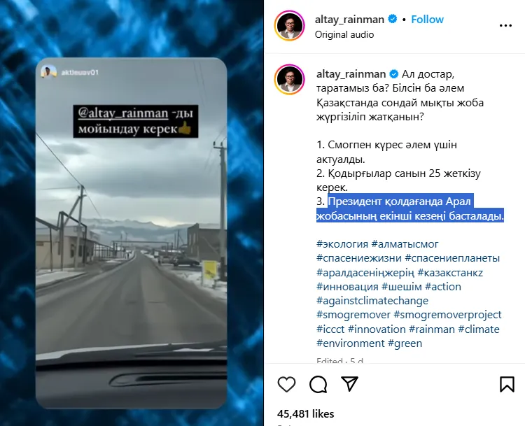 Имя Алтая Айнабека стало широко известно летом 2024 года, когда он предложил проект — восстановить Аральское море, заполнив его дождевой водой. Эта идея, звучащая как научная фантастика, сразу привлекла внимание общественности. Пользователи активно поддерживали инициативу, но не было ясно, на какие научные данные он опирается.