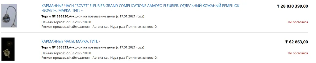 Два лота продавали 27 февраля: карманные часы. Желающих не нашлось, хотя одно из изделий стоило всего 62 тысячи тенге.