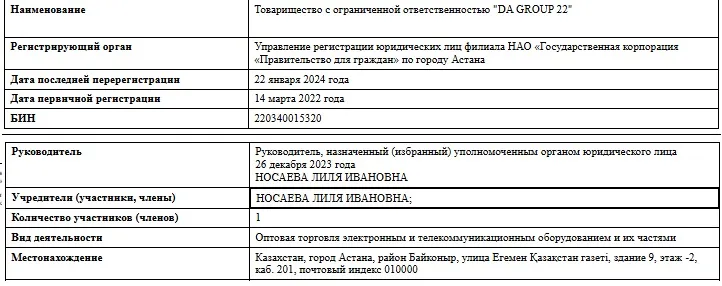 Астанинскую компанию Da Group 22 создали вскоре после начала войны России в Украине – 14 марта 2022 года. Изначально директором и учредителем значилась Айнур Ахметбекова. Уже в августе её сменил Дастан Ахметбеков, по всей видимости, родственник.
