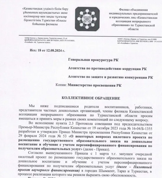 Ранее корреспондент CMN.KZ рассказал о том, как в РК запускали пилотный проект по размещению государственного образовательного заказа на дошкольное воспитание и обучение (аналог программы ArtSport, только для детских садов). Его реализация сразу же вызвала обеспокоенность у сотни непосредственных участников. Получив, наконец, ответы чиновников на поднятые в обращении общественности вопросы, публикуем их для наших читателей