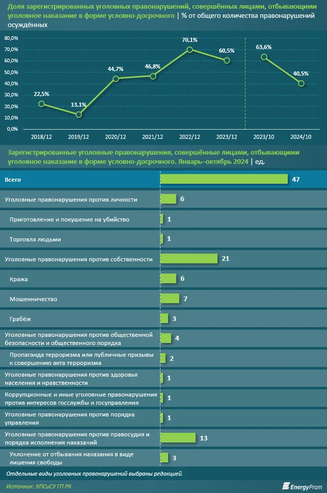 «За десять месяцев 2024 осуждённые на условный срок совершили 47 новых уголовных правонарушений. Почти половина из них (21 случай) относились к правонарушениям против собственности — кражам, мошенничеству, грабежам. Однако встречаются среди условно осуждённых и те, кто, будучи под пробационным контролем, совершает такие дикие преступления, как торговля людьми, приготовление и покушение на убийство, пропаганда терроризма и другие».