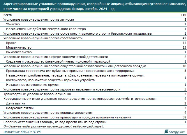 За десять месяцев 2024 года зарегистрировали 116 уголовных правонарушений, совершённых теми, кто уже отбывает наказание за предыдущие преступления и проступки. Это на 18,9% меньше, чем за аналогичный период прошлого года, пишет Еnergyprom.kz.