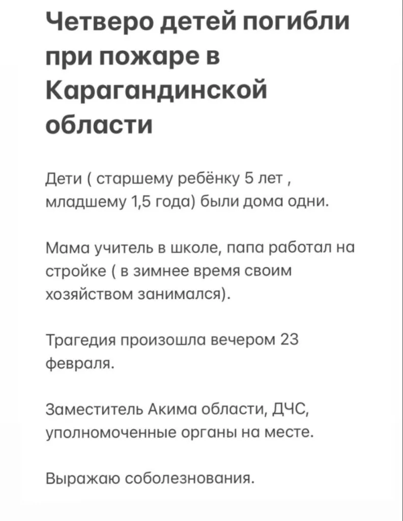 Трагедия случилась вечером 23 февраля в селе Талды Каркаралинского района. Сейчас полиция выясняет обстоятельства произошедшего. Пока известно только то, что пожар начался в 2-х квартирном одноэтажном жилом доме. Там горели домашние вещи, мебель, оконные и дверные блоки на площади 10 кв.м. В результате пожара погибло 4 ребенка 2019 г.р., 2020 г.р., 2021 г.р., 2022 г.р.