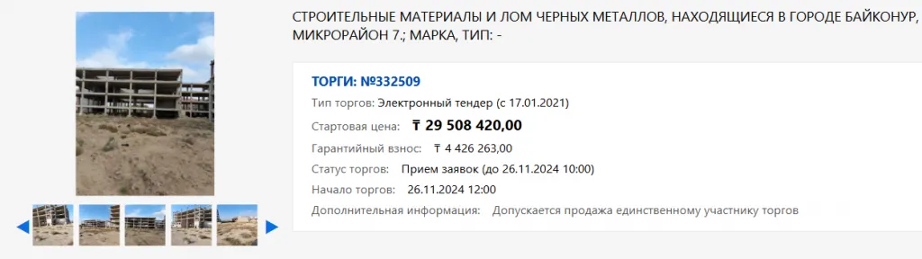 Один из объектов имущества находится в черте города Байконур, а второй прямо на территории космодрома. Общая стоимость активов стартует от 40,9 млн тенге. Оба аукциона пройдут 26 ноября в 12:00, подать заявку можно за два часа до начала торгов. Допускается продажа единственному участнику торгов.
