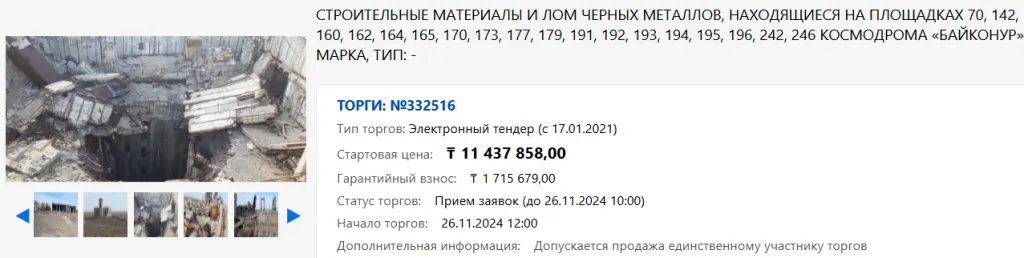 Кроме того, покупателю придётся получить разрешение на въезд и вывоз имущества с территории космодрома «Байконур».