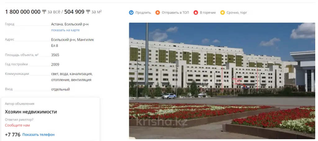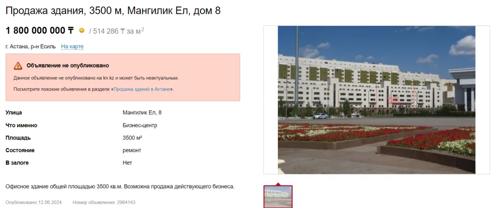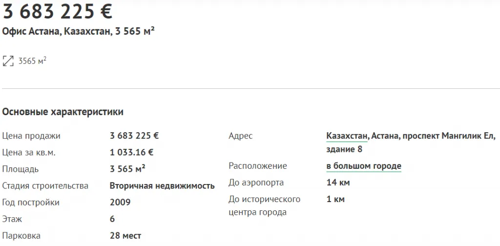 Как оказалось, продают подъезд в Доме министерств не только на российском сайте, но и на казахстанских. Так, на Krisha.kz и Kn.kz та же самая площадь почему-то обойдётся покупателю дешевле, но только если покупать в тенге. За 3565 квадратных метра просят 1,8 млрд тенге, что составляет 3 506 174,7 евро (по курсу Нацбанка на 1 августа). Это на 177 тысяч евро дешевле, чем указано на российском сайте. Квадратный метр в тенге обойдётся потенциальному покупателю в 504 909 тенге. Отметим, что сайте недвижимости Kn.kz объявление о продаже опубликовали 12 июля, но сейчас оно уже неактуально.
