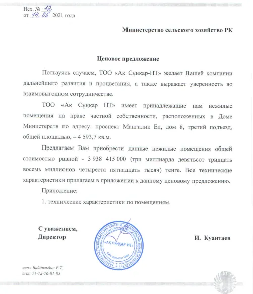 За 4593 квадратных метра в Доме министерств в ведомстве заплатили около 3,9 млрд тенге. Владельцем строения выступало ТОО «Ақ сұңқар НТ», принадлежащее Талгату Ахметову. После продажи эта компания больше не участвовала в государственных закупках.