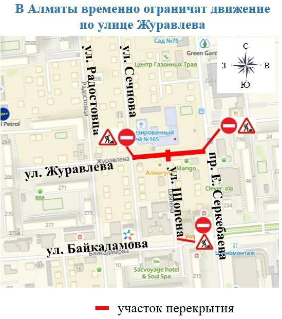 Как уточнили в ТОО «Алматинские тепловые сети», движение по улице Журавлева от проспекта Серкебаева до улицы Сеченова будет ограничено с 6:00 20 сентября до 6:00 30 сентября.