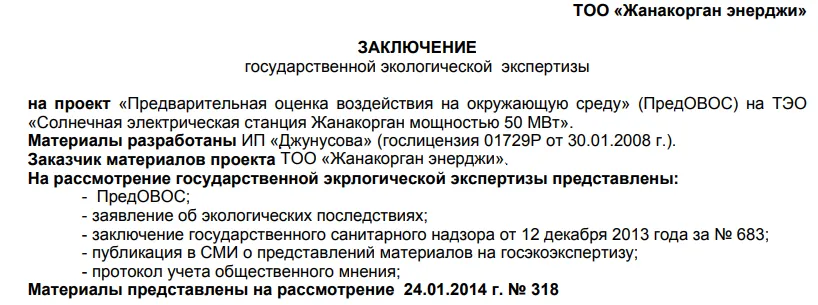Кроме ТОО «Leodar», у Алибека Касымова есть и другие предприятия. Особенно интересно ТОО «Жанакорган энерджи», которое должно было строить солнечную электростанцию за 17,1 млрд тенге в Кызылординской области. Мощность объекта составляла 50 млн кВт/ч в год. Именно под этот вариант компания и получала заключение государственной экологической экспертизы. Хотя на II Международном форуме «Байконур» в ноябре 2013 года цифры указывали другие: мощность солнечной электростанции была выше – 65 млн кВт/ч в год, а цена ниже – 14,4 млрд тенге.