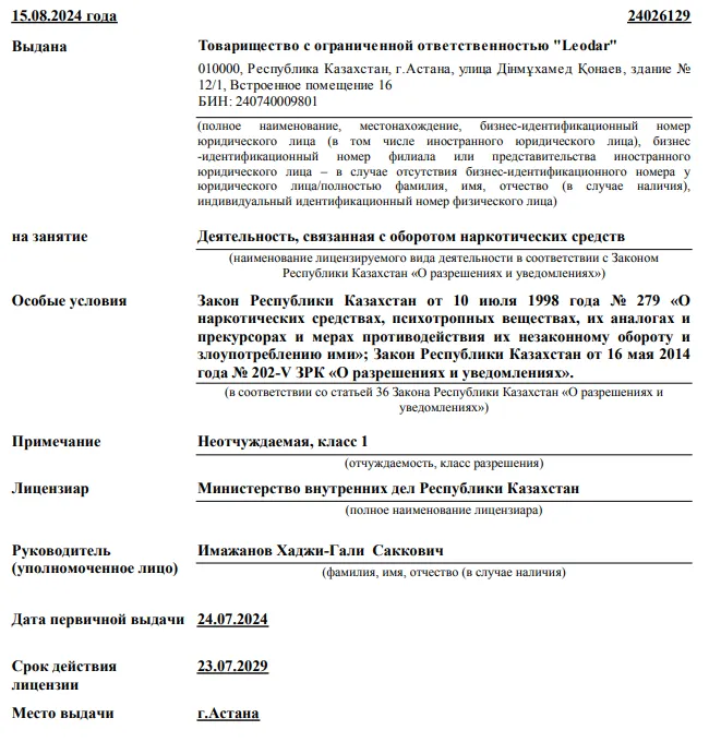У ТОО есть действующая лицензия на деятельность, связанную с оборотом наркотических средств. Документ ТОО выдали 15 августа 2024 года сроком на пять лет.