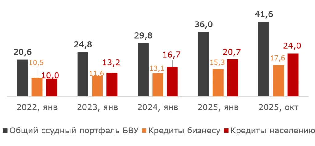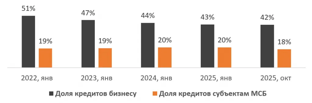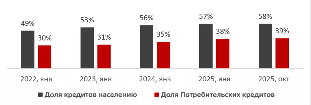 Данные показывают, что ссудный портфель растёт не благодаря бизнесу, а за счёт населения. Как уже ранее было сказано, в 2025 году 58% всех кредитов — розничные, а потребительские займы — самый быстрорастущий сегмент банковской системы. При этом доля малых предприятий в портфеле бизнеса остаётся около 18–20%.