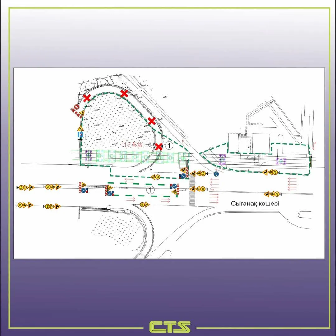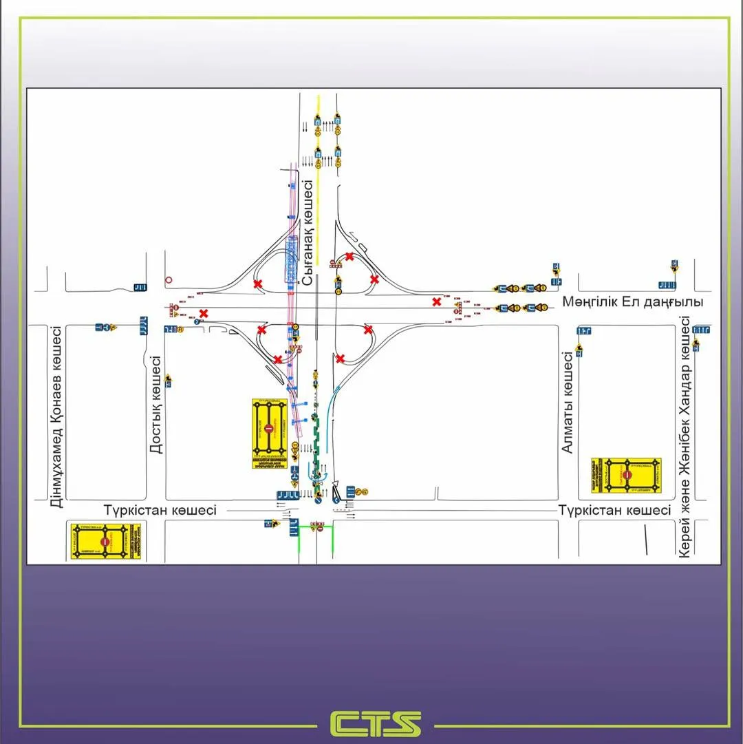 - с 25 марта по 25 апреля – по ул. Сыганак на развязке с пр. Мангилик Ел в направлении ул. Туркестан для выполнения работ по строительству фасада станции 113, производится частичное сужение двух полос и занятие крайних левых полос в обоих направлениях на разрыве разворота автодороги;
