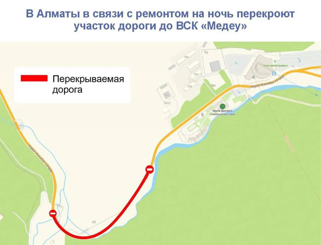Как сообщают в акимате Алматы, движение будет перекрыто на участке от родника «Акбулак» в сторону ВСК «Медеу» протяженностью 500 метров с 23:00 16 августа до 7:00 17 августа.