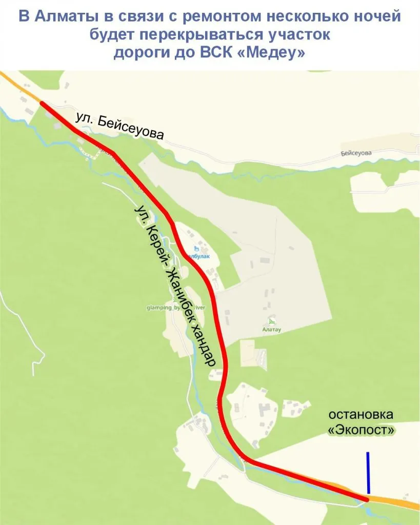 Движение будет перекрываться на участке от остановки «Экопост» до улицы Бейсеуова в ночное время с 23:00 до 6:00 с 6 до 10 сентября.