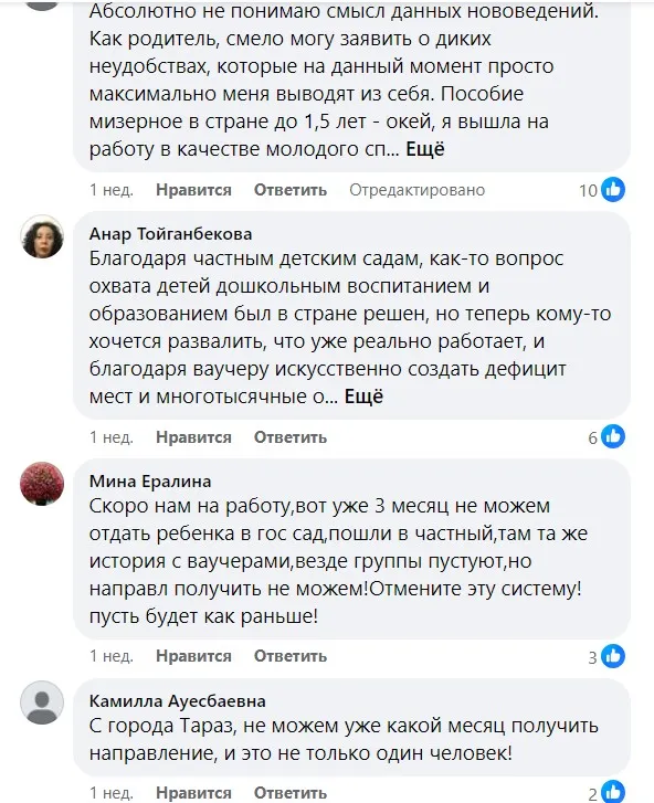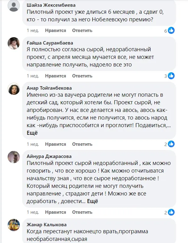 "Всё это привело к тому, что уже несколько месяцев администрации детских садов по только Туркестанской области не могут нормально ни принять, ни открепить воспитанников в дошкольных учреждениях, что приносит убытки. Авторы проекта уверяют, что новая система Indigo основана на принципе «деньги следуют за ребёнком», и пилотный проект якобы повысит качество дошкольного образования, позволив выбрать наиболее подходящие для ребёнка детские сады и контролировать качество услуг. При этом действующая система зачисления и без ваучерного финансирования позволяет родителю выбрать любой детский сад и контролировать качество услуг", – говорится в обращении.