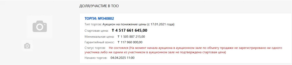 Это вторая попытка государственной компании продать актив на торгах. В прошлый раз аукцион не состоялся 20 марта. Спустя пару часов после этого сотрудники СПК "Жетысу" снова выставили лот. Пройти торги по продаже 49% доли ТОО "АксуКант" должны были 4 апреля в 11:00, но желающих не нашлось. По правилам аукциона на понижение, стартовая цена начиналась с 4,5 млрд тенге. Минимально могли предложить 1,5 млрд тенге.