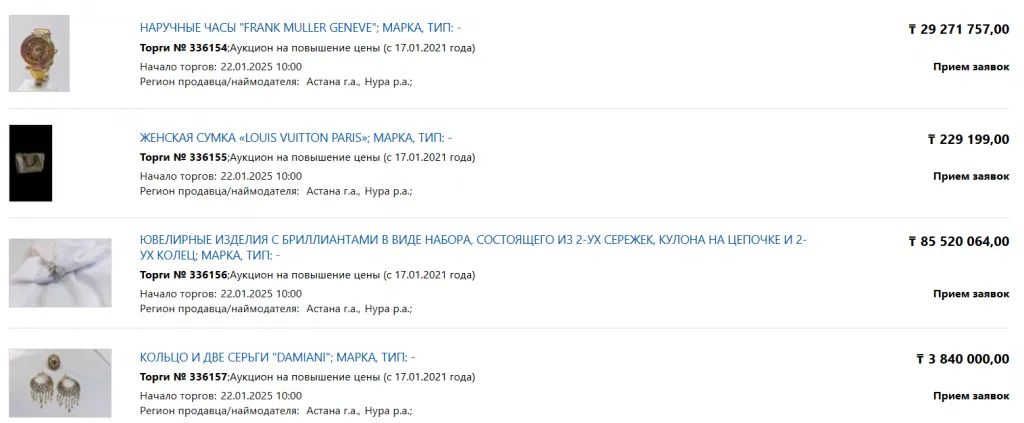 Ранее отдел расследований уже писал об элитном имуществе, которое вернули государству. Всего Казахстану отдали 198 украшений. В конце сентября прошлого года на электронных торгах впервые выставили эти изделия: