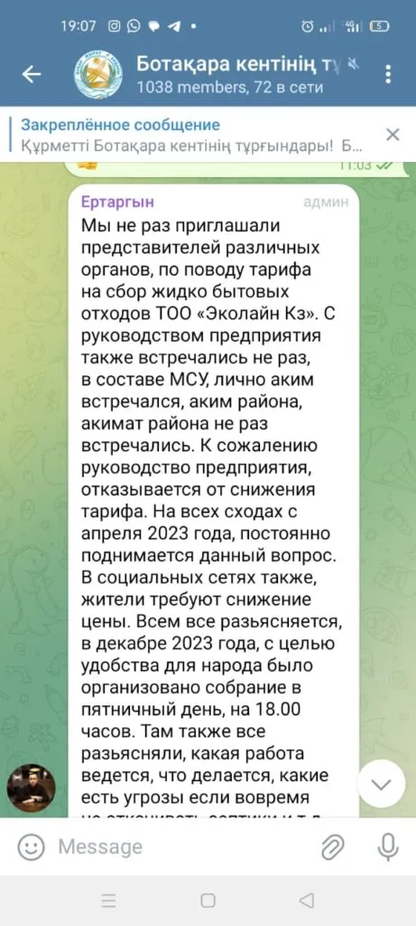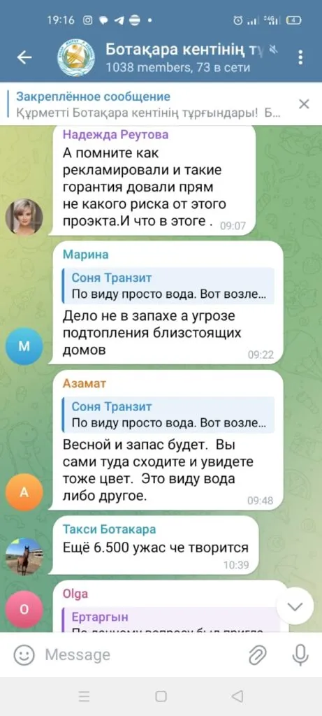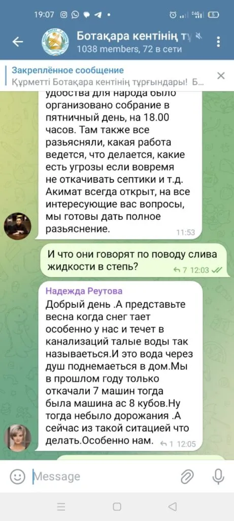 У жителей поселка и акимата есть telegram-канал, в котором они обсуждают сложившуюся ситуацию. В этом же канале присутствуют и предприятие "Ботакара Су", отвечающее за водоснабжение, а также директор «EcoLine» Алмас Аяпбергенов.