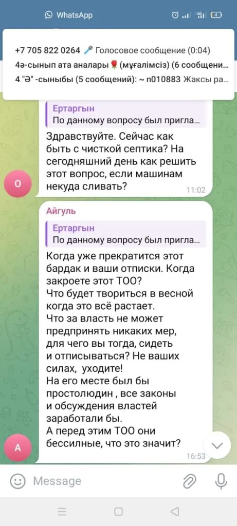«Когда население подняло шум, что «EcoLine» в степь сливает отходы, я собрал местное самоуправление. Общим решением утвердили протокол и сейчас наши ассенизаторские машины сливают ЖКО в прежнее место. Алмасу это не понравилось и он написал жалобы в Антикор, в Агентство по делам госслужбы и в Депкологии. Заявил, что я действую противозаконно».