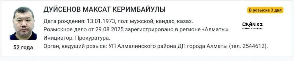 Речь идёт о Максате Дуйсенове. Информация об этом появилась на сайте органов правовой статистики и специальных учётов Генпрокуратуры.