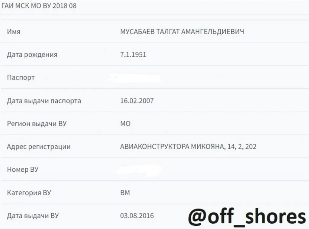 Российский паспорт, полученный Талгатом Мусабаевым в 2007 году, всплыл в 2016. Тогда он получал новые водительские права. По данным telegram-канала "Выход к морю", спустя три года документ ещё действовал. На него оформили карту в банке, куда Мусабаеву поступали незначительные суммы.