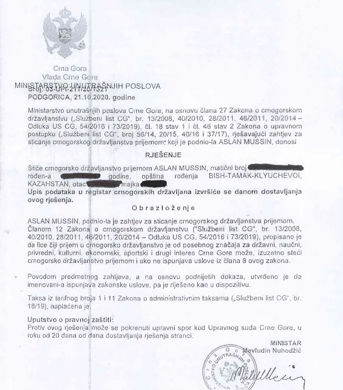 Несмотря на запрет на двойное гражданство, в Черногории разрешали оставить старый паспорт в рамках инвестиционной программы. Новые граждане страны должны были разово оплатить 100 тысяч евро и вложиться в недвижимость. Стоимость последней варьировалась от 250 тысяч евро до 15 млн евро. Оставил ли Аслан Мусин голубой паспорт или отказался от него, неизвестно.