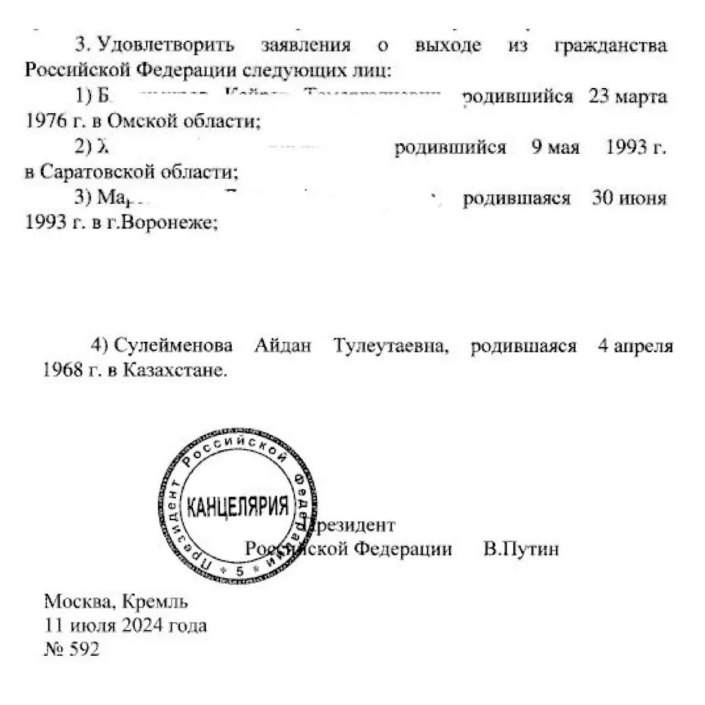 Летом 2024 года стало известно о двойном гражданстве Айдан Сулейменовой, жены казахстанского миллиардера из списка Forbes Данияра Абулгазина (состояние 380 млн долларов на май 2024 года). Успешная рантье с выручкой 5,1 млрд тенге сама отказалась от российского гражданства.