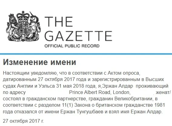 В октябре 2017 года гражданство официально сменил и сын известного казахстанского предпринимателя Алдара Тунгушбаева – Ержан. Он отказался от фамилии и стал Erjan Aldar. Запись об этом появилась в британской газете.