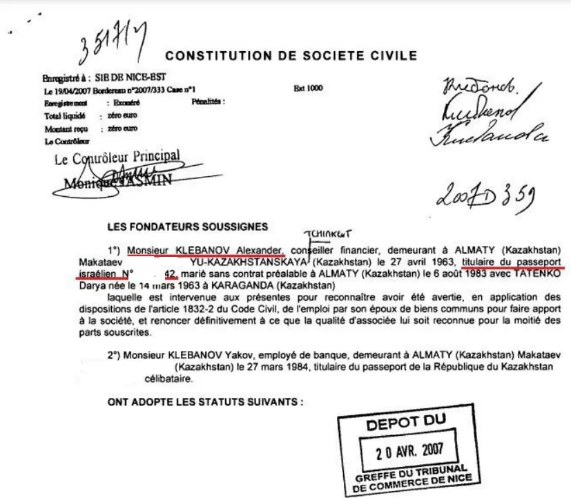 Иностранный паспорт нашли у Александра Клебанова, который владеет АО «Центрально-Азиатская топливно-энергетическая компания». Оказалось, он давно получил гражданство Израиля . Документ Клебанов "засветил" при оформлении компании Roche D'azur в Ницце ещё в 2007 году. В том же году казахстанский миллиардер использовал и казахстанский паспорт. На него оформляли компанию Sci Du 985 Chemin Du Retenaou, которая владела недвижимостью на Лазурном берегу.