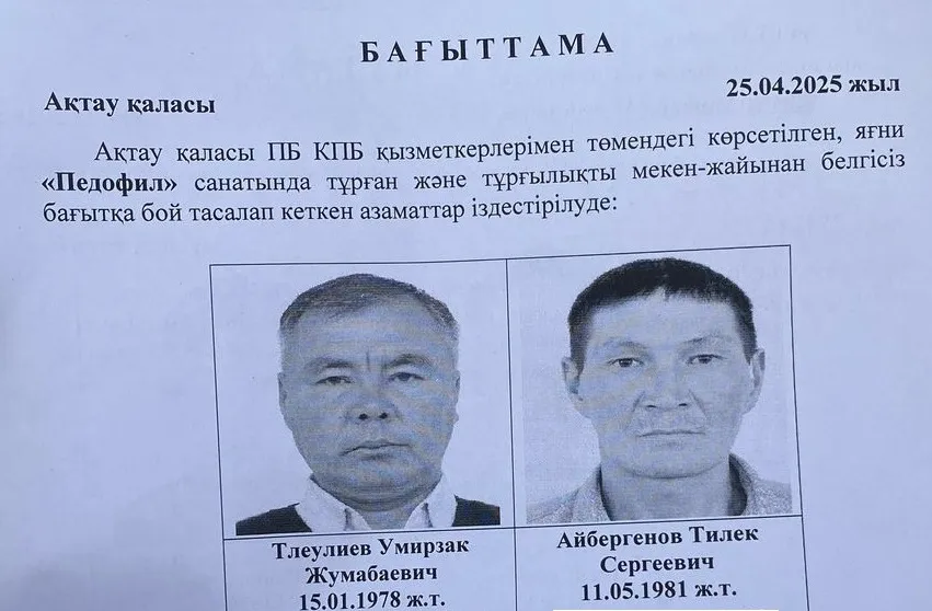 Жители Актау накануне забили тревогу, по всем местным соцсетям разлетелась ориентировка на двух мужчин, которых ищет полиция. В ориентировке говорилось, что оба ранее были осуждены за тяжкие статьи - развращение, либо изнасилование малолетних.