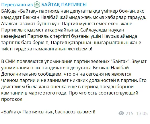 Налибай возглавлял филиал партии BAYTAQ по Туркестанской области. Однако в сентябре 2023 года в политорганизации сообщили, что Бекжан Налибай не является членом партии и не занимает никаких должностей.