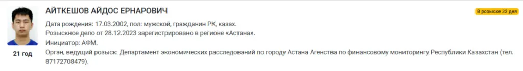 Ориентировку на Айдоса Айткешова разместили на портале правовой статистики.