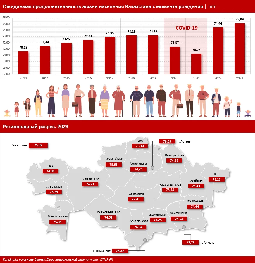 По итогам 2023 года ожидаемая продолжительность жизни населения в Казахстане, начиная с момента рождения, увеличилась и достигла своего текущего максимального значения: 75,09 года.