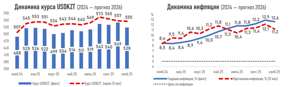 Отмечается, что на горизонте следующих 12 месяцев давление на нацвалюту может сохраниться – курс прогнозируют на отметке 554,6 тенге. Решающими факторами станут продолжающееся падение доходов от экспорта сырья, сопровождающегося ростом импорта (реализация инвестиционных и инфраструктурных проектов), а также резкое сокращение трансфертов из Нацфонда в 2026 году.