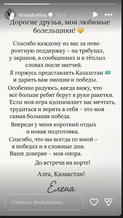 Рыбакина сообщила, что впереди у нее короткий отдых, после чего она будет готовиться к предстоящему сезону.