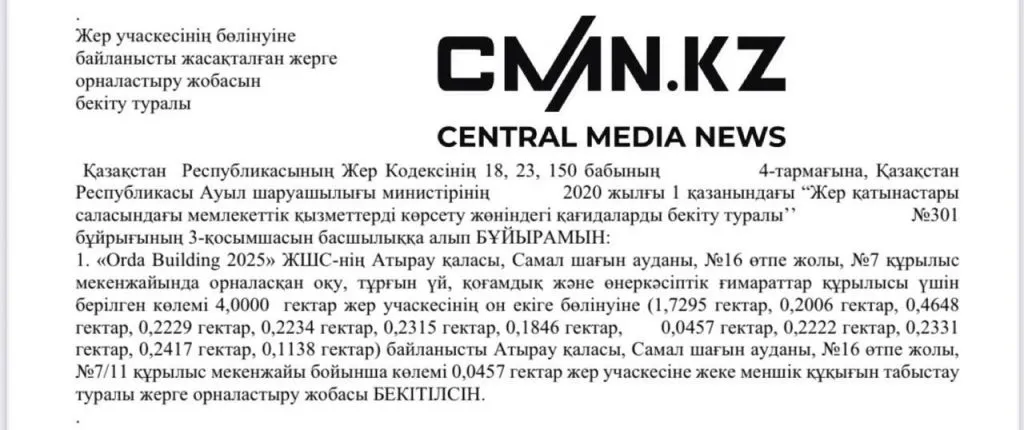 «ТОО „Orda Building 2025“ г. Атырау, микрорайон Самал, проезд №16, строение №7, для строительства учебных, жилых, общественных и промышленных зданий, расположенных по адресу: на двенадцать делений земельного участка площадью 4,0000 га (1,7295 га, 0,2006 га, 0,4648 га, 0,2229 га, 0,2234 га, 0,2315 га, 0,1846 га, 0,0457 га, 0,2222 га, 0,2331 га, 0,2417 га, 0,1138 га) г. Атырау, микрорайон Самал, проезд №16. Передача права частной собственности на земельный участок площадью 0,0457 га по адресу строительства №7/11 о землеустроительном проекте», — говорится в документах.