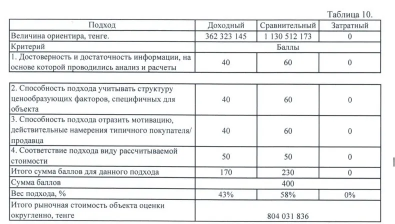 В сентябре 2023 года сотрудники ТОО "Независимая оценочная компания "Expert" провели оценку пятиэтажного нежилого помещения. По сравнительному анализу с аналогичными объектами стоимость актива превысила 1,3 млрд тенге. А вот по доходному подходу оценки недвижимости вышло меньше – 362 млн тенге. Оценщики свели все данные к одному знаменателю. Итого оценочная стоимость составила 804 031 836 тенге.