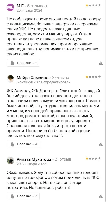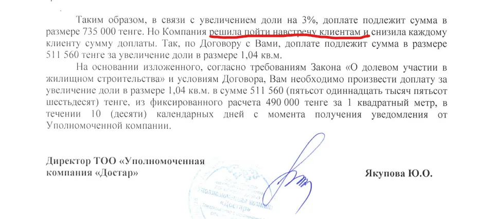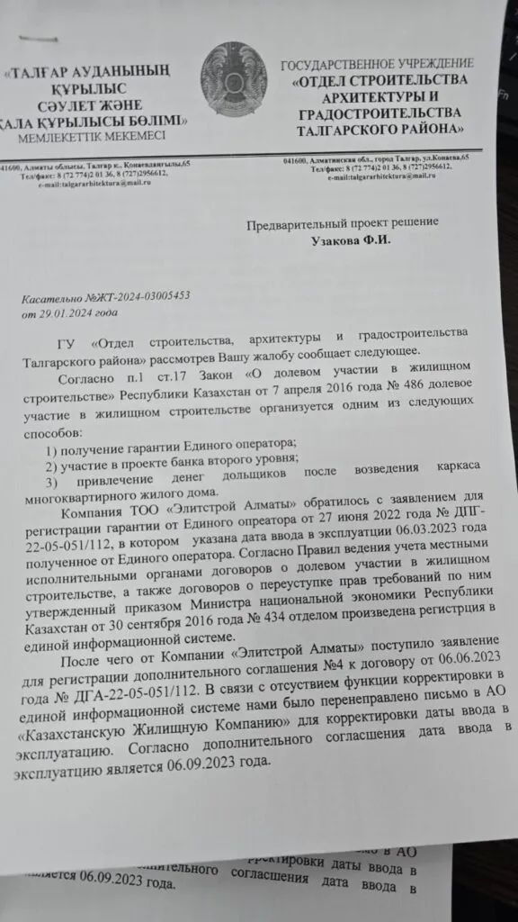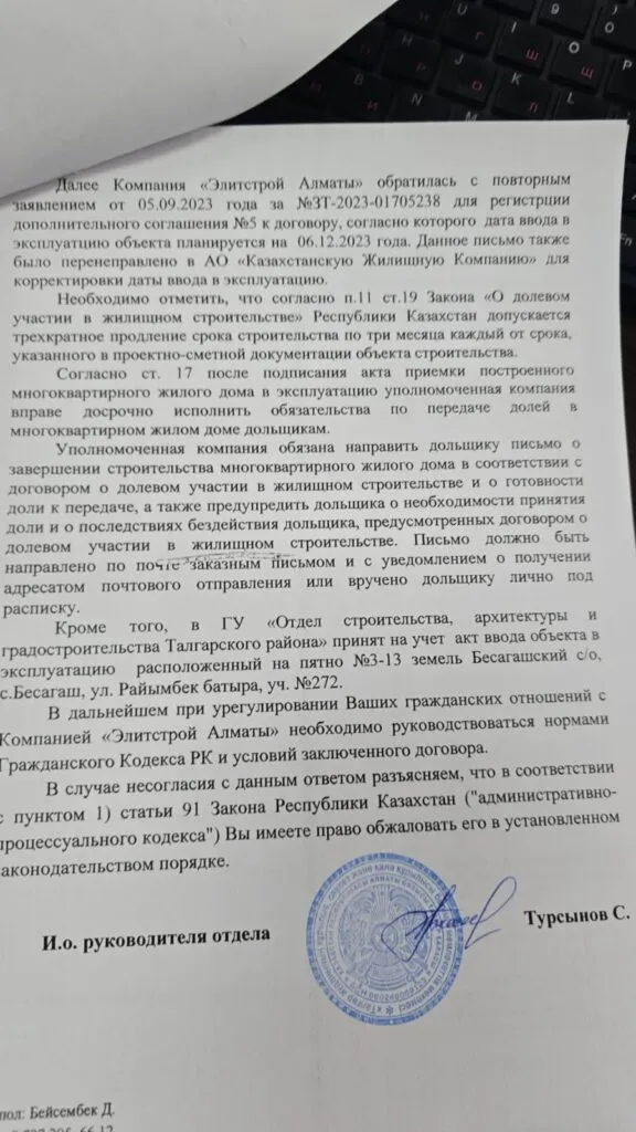 «Оформляла ипотеку в ноябре 2022-го. По договору мы должны были получить ключи 6 марта 2023-го. Никаких уведомлений о просрочке. Писала в отдел продаж, но они ссылались на отсутствие денег. Позже менеджер Алибек сказал, чтобы получить квартиру надо заплатить ещё за добавочные квадратные метры. В Отбасы банке даже не приняли во внимание, что это нарушение договора. Закон есть, но застройщик разными способами его обходит без каких-либо препятствий. Вводят граждан в неведение и отправляют подписать новый договор, пользуясь незнанием законов».